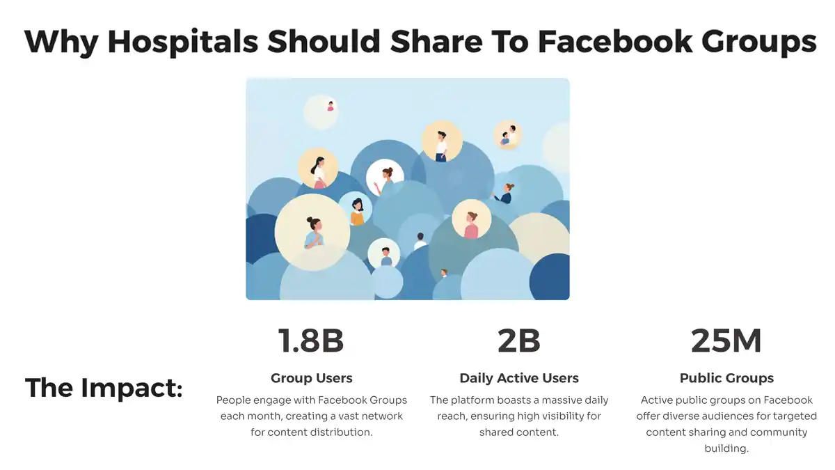 The payoff is significant. By engaging with Facebook Groups, hospitals extend their reach beyond their own followers, building stronger trust within the broader community. This strategy also provides valuable feedback on which topics spark the most interaction, helping refine a hospital’s overall content marketing strategy.